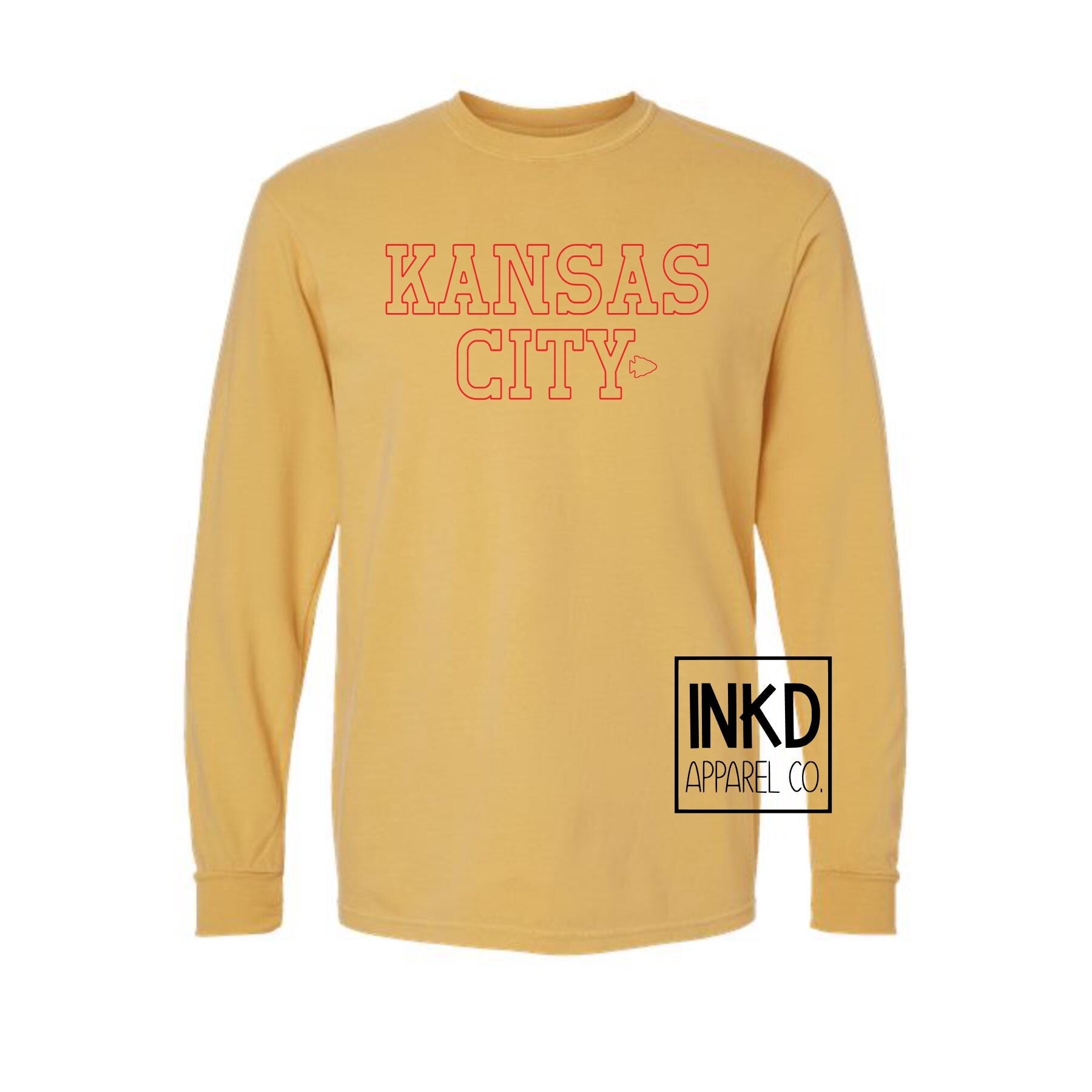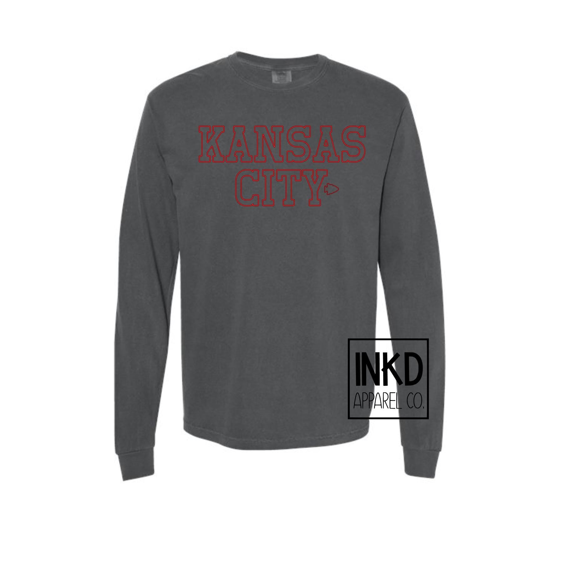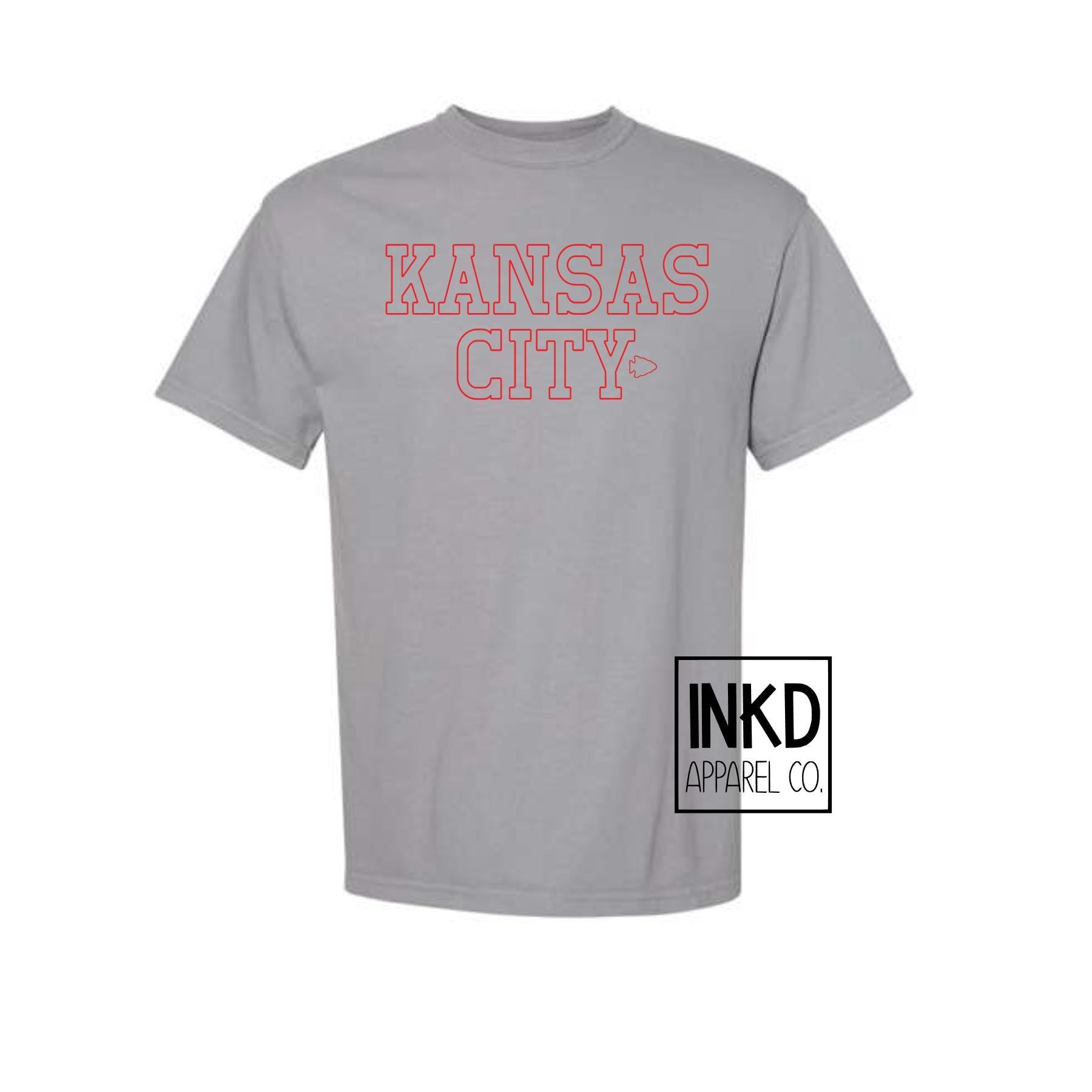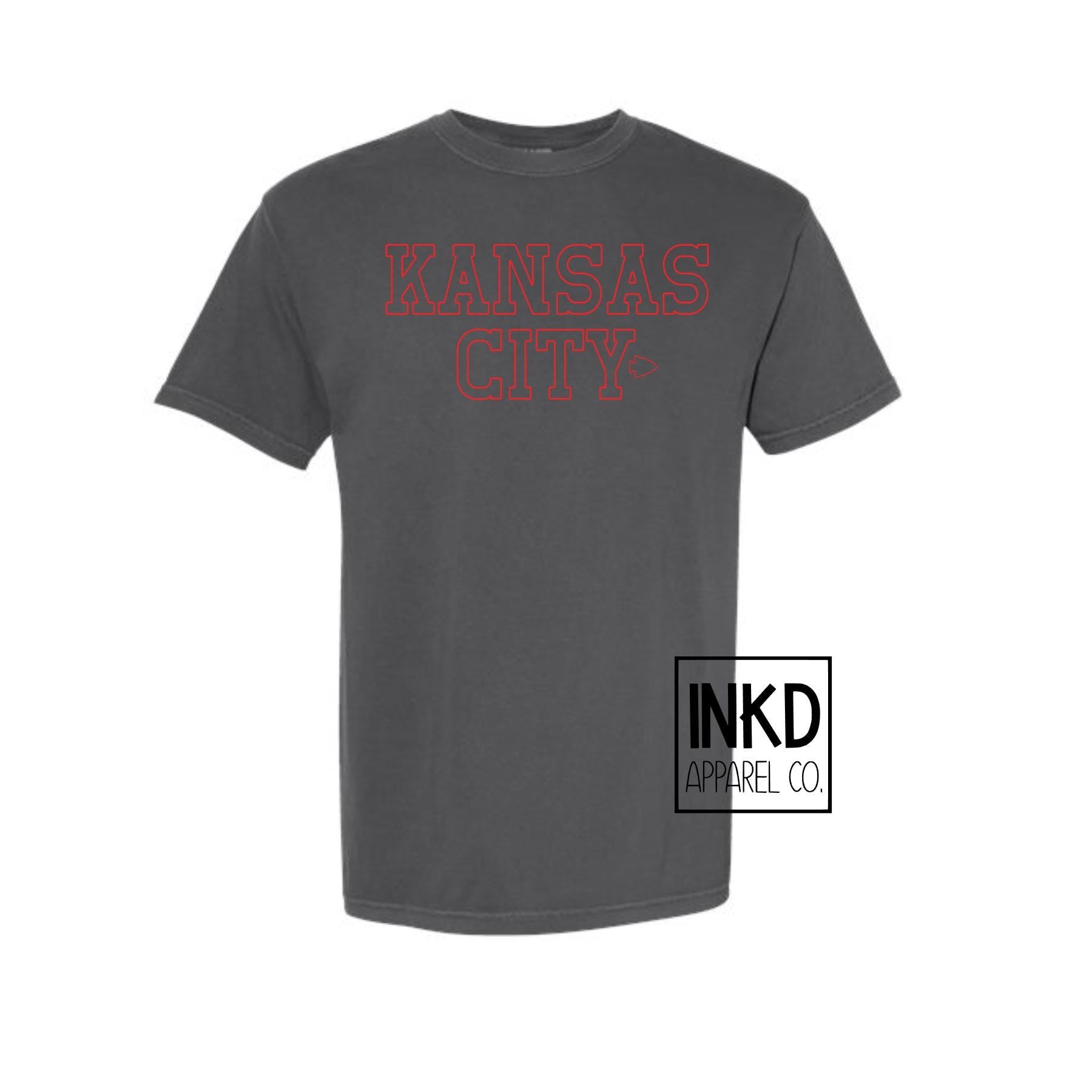 These screen printed tees are comfy and their natural dyed wash effect makes them soft and trendy. Simple Kansas City outline font with small arrowheads are printed in Red Ink with a distressed font to give that perfect vintage look. Looking for sweatshirts & hoodies? Those are located in another listing! Comfort Colors 100% ring spun cotton, 20 singles Garment dyed for that lived in feel and almost no shrinkage at home. Soft ring spun cotton fabric with 100% cotton threads Relaxed fit Topstitched, classic width, collar Twill taped neck and shoulders for comfort and durability Rib cuffs Shoulder to shoulder twill tape Signature twill label Made With Respect Proud member of the U.S. Cotton Trust Protocol Made with OEKO-TEX certified low-impact dyes Our clean pigment dye colors are salt free